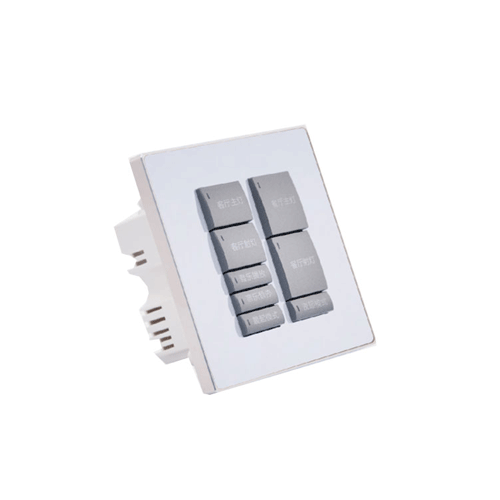 86式可編程輕觸面板;可編程輕觸面板;客戶可自定按鍵數(shù)量(6~14 鍵);2路IO輸入,可接傳感器輸入;按鍵可自行打標文字、圖案;每個 按鍵都在獨立的狀態(tài)反饋指示燈;多種面板材質(zhì)選擇高雅而又尊貴; 設備ID號可通過拔碼開關設定,安裝維護方便;型號后綴X表示面板 材料及顏色,可選:0鋁銀色/3鋁香檳金色/6玻璃黑色/9玻璃白色;標 準86式墻身底盒安裝方式,安裝拆卸方便。
