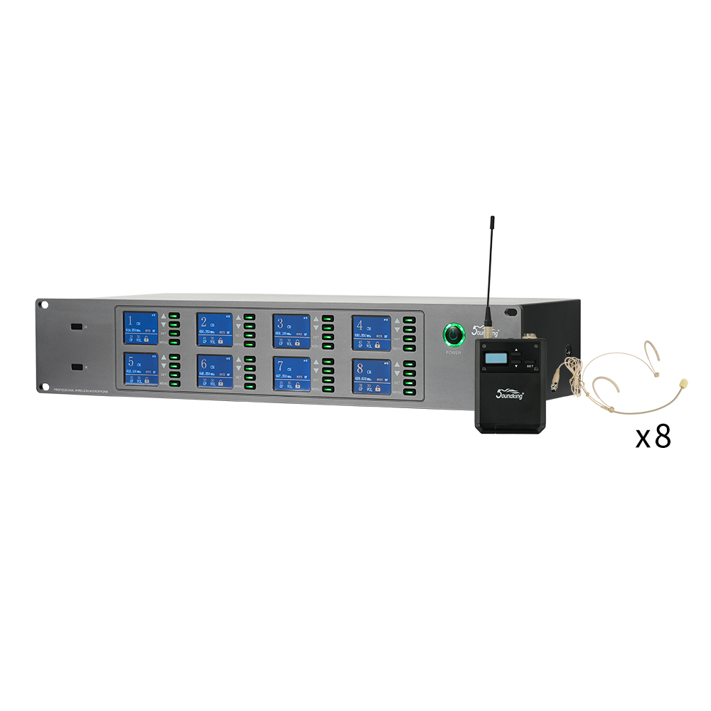 1. 一臺(tái)八通道無(wú)線麥克風(fēng)收發(fā)主機(jī)和8臺(tái)腰包式發(fā)射器組成的麥克風(fēng)系統(tǒng);